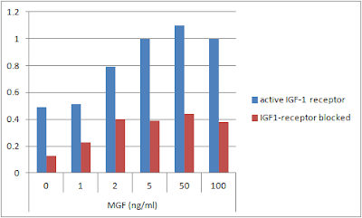 As the data in figure 4 goes to show the effects of the complete polypeptide IGF-1 and its splice variant MGF appear to be mediated, at least partly via distinct receptors. And while recent research suggest that MGF also exerts similar effects on tendon (Olesen. 2006), brain (Dluzniewska. 2005) and nervous tissue (Aperghis. 2004), our primary concern here, is its pivotal role in muscle repair, which involves the activation of satellite cells, their proliferation (Yang. 2002) and migration (Mills. 2007).