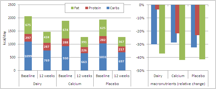 If you take closer look at the analysis of the dietary records the subjects had to keep, you will notice that the minor differences in the dietary prescriptions induced quite profound changes as far as the macronutrient composition of the respective diets was concerned. While the subjects in the non-dairy groups, regardless of whether they received a calcium supplement or placebo, cut back on all the three major macronutrients, the requirement to incorparate three servings of dairy into their meal-plan, alone appeared to suffice to keep the protein intake of the dairy group at a reasonably high level (~72g; which would be 0.96g/kg body weight). The protein intake of the two non-dairy groups, on the other hand dropped to 57g (0.75g/kg) and 54g (0.7g/kg) for the calcium and placebo supplemented groups, respectively.