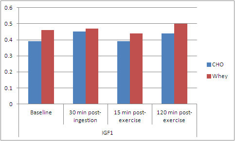 In their randomized double-blinded cross-over study, Cooke et al. had a group of 10 recreationally active men (2-3 non-resistance training exercise sessions per week) perform a lower body exercise program (leg presses and knee extensions, 4 sets, 8-10 reps at 80% of the individual 1RM) with either 10g of maltodextrose or 10g of whey 30 minutes before the exercise bout (Cooke. 2011). The results of the study (equal IGF-1 response regardless of whey or carbohydrate supplementation) imply that even in the short term, in healthy subjects and in conjunction with exercise the ingestion of carbohydrates is not superior to the provision of fast acting protein sources as a means to either increase or maintain systemic IGF-1 levels.