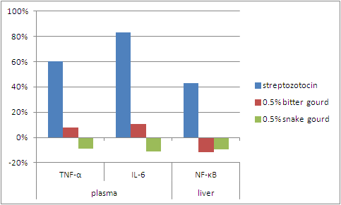 Figure 3: Relative expression of inflammatory cytokines, TNF-alpha and interleukin 6 in plasma capacity (right) levels vs. non-STZ injected control in streptozotocin injected rats after the 28-day dietary intervention (data calculated based on Saha. 2011)