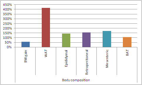 Figure 2: Relative increases in body weight (BW), white adipose tissue weight (WAT), visceral fat weight and brown fat in rats on the "high fat diet" (data adapted from Malik. 2011).