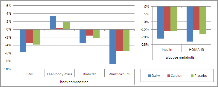 Figure 2: Changes in body composition and measures of insulin sensitivity after 12-weeks on the high dairy, calcium supplemented or placebo supplemented diets (data calculated based on Smilowitz. 2011)