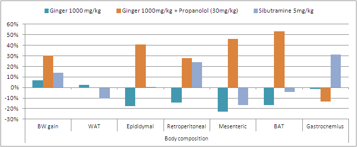 Figure 5: Relative increases (vs. control on normal diet) in body weight (BW), white adipose tissue weight (WAT), visceral fat weight and brown fat in rats on the "high fat diet" supplemented with ginger, ginger + propanolol, or sibutramine (data adapted from Malik. 2011).