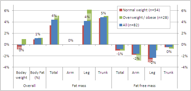 Figure 2: Relative changes in anthroprometric measures over the holiday season; left axis - overweight / normal weight, right axis + figures - all (data adapted from Hull. 2006)