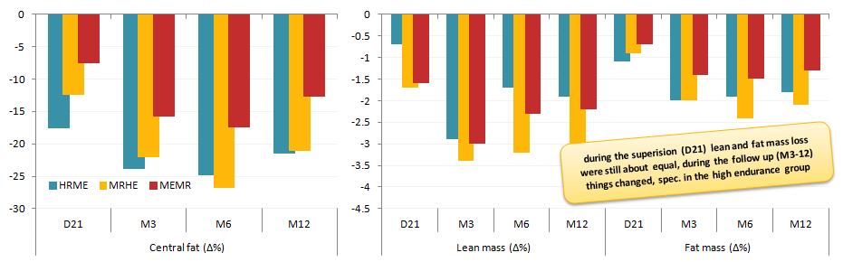 Apropos, the dropout rates of the individual groups were 10/34 for the HRME, 8/32 for the MRHE and 4/34 for the MRME groups. In other words, the less intense the training program the more likely the subjects were to stick to it.