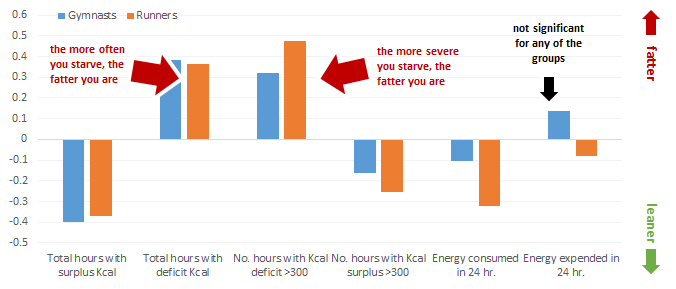 The first noteworthy observation the scientists made is the adaptiation induced amelioration of the energy deficit. Contrary to what the simply calories in vs. calories out equation would suggest, the participants who received 25% less energy than they would need ended up having an effective energy deficit of only 20.5% - in other words, the missing 4.5% were simply conserved by the dreaded metabolic downregulation that’s one of the most important reasons for weight loss plateaus.