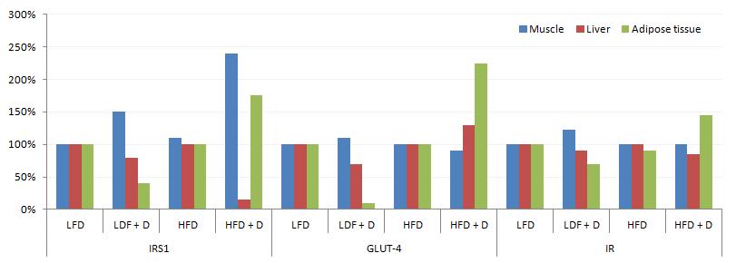 figure 1, you see that in muscle tissue of LFD-fed mice, vitamin D treatment increased vitamin D receptor (VDR, not shown) to 2.03-fold and insulin receptor substrate (IRS-1) to 1.5-fold. An even more pronounced increase in IRS-1 (+140%; IRS proteins play a key role in transmitting signals from insulin receptors to the intracellular pathways, as well as growth promotion) expression occurred in the mice that were fed the obesogenic high fat diet - in this case, the increase was yet accompanied by a -50% reduction in VDR expression (not shown) without having downstream effects on GLUT4 expression.