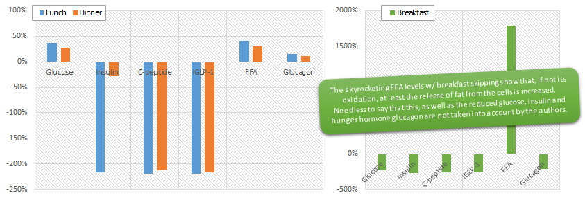 In this group of subjects, skipping breakfast increases post-prandial hyperglycemia (PPHG) after lunch and dinner. It lowers the important GLP-1 response to the meals (learn more about how GLP-1 is important in "Eat More, Burn More and Lose Fat Like on Crack with GLP-1!?") and impairs the subjects' already messed up insulin response. More specifically,