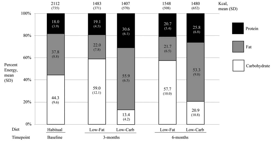 Figure 2 tells you that they restricted their energy intake by noteworthy 30% on average (the ~600kcal-deficit also explains why the subjects even lost weight), with no difference between the subjects on the allegedly more satiating low carb vs. low fat diet.