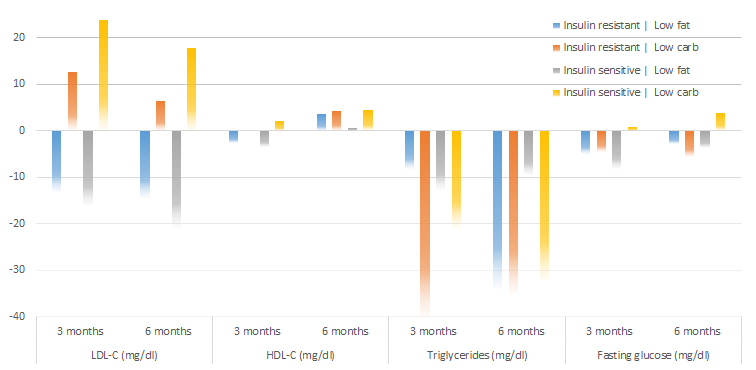 This doesn't solve the dilemma we're in, though: without further data on particle sizes and oxidative status of the LDL molecules, etc. it is virtually impossible to make a reliable prediction which of the two diets is going to have the higher long-term health benefits. What may be even more important, though, is that we must not forget that it is not debatable that both diets triggered significant weight loss and measurable health improvements, especially in the subjects with pre-existing insulin resistance (blue and orange bars in