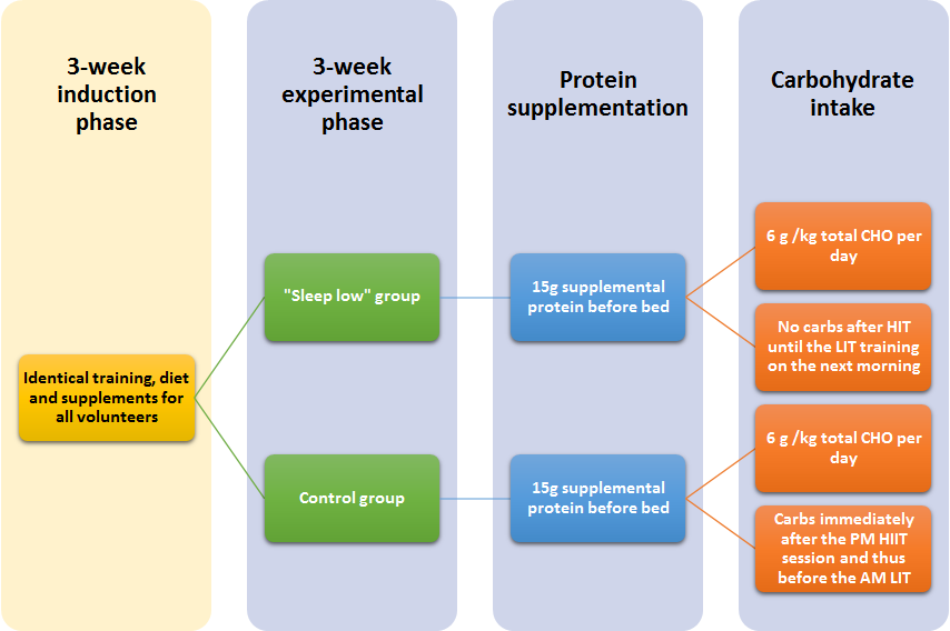 Marquet et al. implemented this principle in a way I tried to illustrated in Figure 1. More specifically, they tried to maximize the subjects' performance during PM high-intensity training (HIT) by providing copious amounts of carbohydrates before the session and restricted the carbohydrate intake to close to zero after this glycogen-depleting workout.To test the efficacy of this protocol, the scientists used a 2x3 week study design in which the first 3 weeks were used to standardize the volunteers training regimen (10-15 h·wk- 1 : 40% running, 35% cycling, 25% swimming), assess subjects' compliance to the study demands and ensure they all attained similar baseline fitness measures before study commencement.